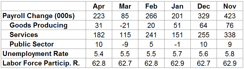 Total nonfarm payroll employment rose by 223,000 in April, up from last month’s revised estimate of 85,000. The unemployment rate dropped slightly to 5.4 percent, the lowest since 2008. The Federal Reserve has placed its full-employment estimate between 5 percent and 5.2 percent.