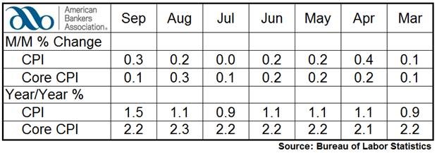 The Consumer Price Index increased 0.3% in September on a seasonally adjusted basis. Over the last 12 months, the all-items index rose 1.5%, its largest 12-month increase since October 2014.