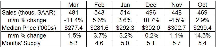 The median sales price of new homes sold was $277,400, down 1.5 percent from last month. The average price was $343,300, a 0.6 percent decline from February.