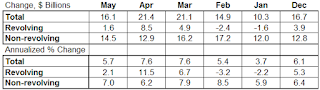 Total outstanding consumer credit increased by $16.1 billion, down $5.3 billion from the previous month’s increase. Total outstanding non-revolving credit increased by $14.5 billion, up from $12.9 billion in April. Outstanding revolving credit increased by $1.6 billion, a much slower pace than April’s $8.5 billion.
