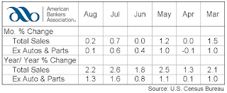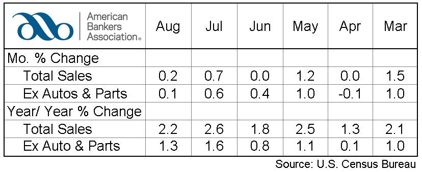 Retail trade sales were generally flat, increasing just 0.1 percent from July, but rising 1.4 percent from August 2014. Sales at food services and drinking places increased 8.2 percent and nonstore retailers were up 6.9 percent from last year.