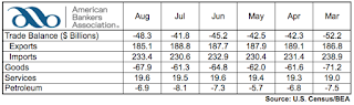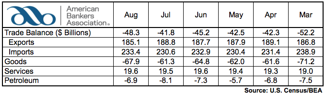 The U.S International trade deficit increased in August to $48.3 billion, up $6.5 billion from June. The higher deficit reflected a decrease in exports and an increase in imports. August exports were $185.1 billion, down $3.7 billion. Imports were $233.4 billion, $2.8 billion more than in July.