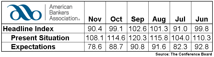 The Conference Board’s Consumer Confidence Index declined for a second straight month in November to a reading of 90.4, down from 99.1 in October and 102.6 in September.