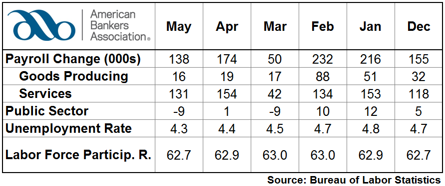 Total nonfarm payroll employment rose by 138,000 in May, a decrease from April’s downwardly revised figure of 174,000, according to the Bureau of Labor Statistics. The national unemployment rate moved down to 4.3%, the lowest rate since May 2001.