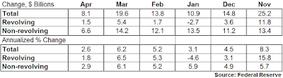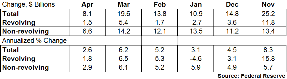 Revolving credit grew at an annual rate of 1.8% to $1.0 trillion, compared to a 6.5% increase in March. Non-revolving credit rose at a 2.9% annual rate, or $6.6 billion, compared to March’s rate of $14.2 billion. Total non-revolving credit is now $2.81 trillion.